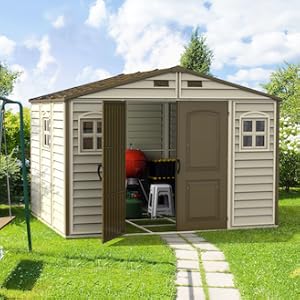 Duramax WoodSide 10 x 8 (8.02 m2) Plastic Garden Shed with 3 Fixed Windows & Metal Foundation Kit, Strong Metal Roof Structure Fire Retardant and Maintenance-Free Storage Shed - Ivory/Brown