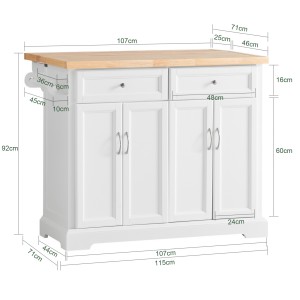 - It has a large worktop with widened board, 2 drawers, 2 cupboards with internal adjustable shelf, 1 towel rack and 4 wheels.