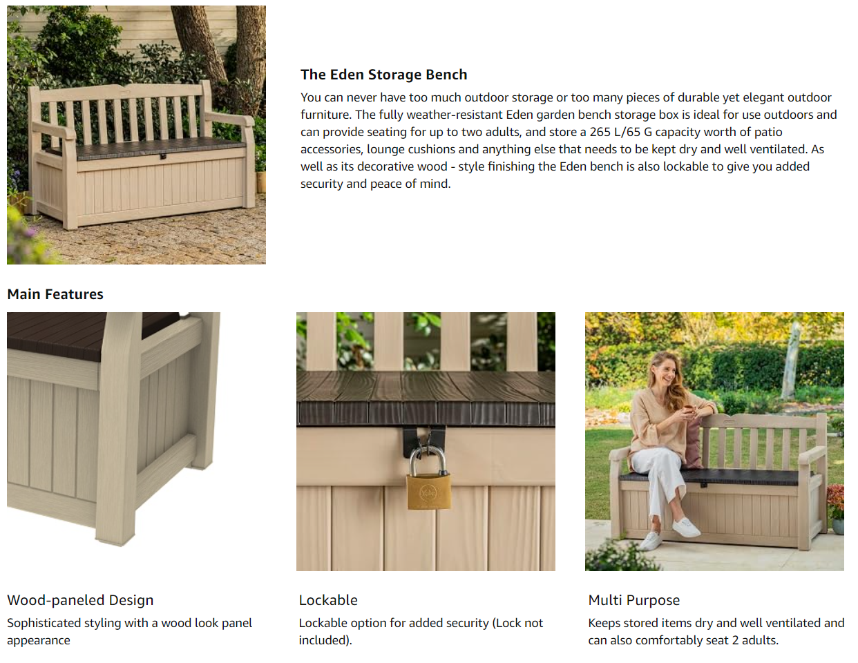 - Ideal outdoor garden bench for garden tools and equipment, garden furniture cushions, garden games and accessories