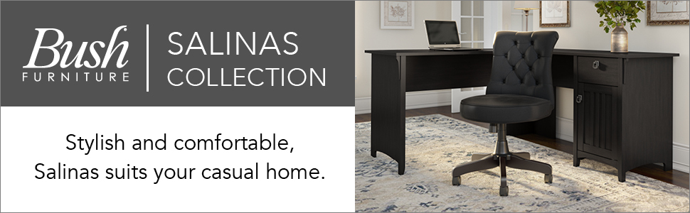 Feel comfortable in your home office with the casual styling of the Bush Furniture salinas collection. The versatile features of the Mission desk with hutch, lateral file cabinet and 5 shelf bookcase help you feel organized and keep your home looking great. Spread out on the desk surface while organizing cords in the cable management system. Store a keyboard or laptop on the pull-out shelf, and stash supplies in a box drawer and cabinet. Display photos, books and more in the open spaces of the hutch and in the 5 shelf bookcase, while you file your worries away in the 2 drawer cabinet. Attractive wood details, vertical accents, curved base rails and tapered legs create a casual look fit for a cottage, family home or apartment. Metal drop pull hardware complements the vintage black finish, which features a distressed touch to add a country feel to your space. Backed by a 1 year warranty.